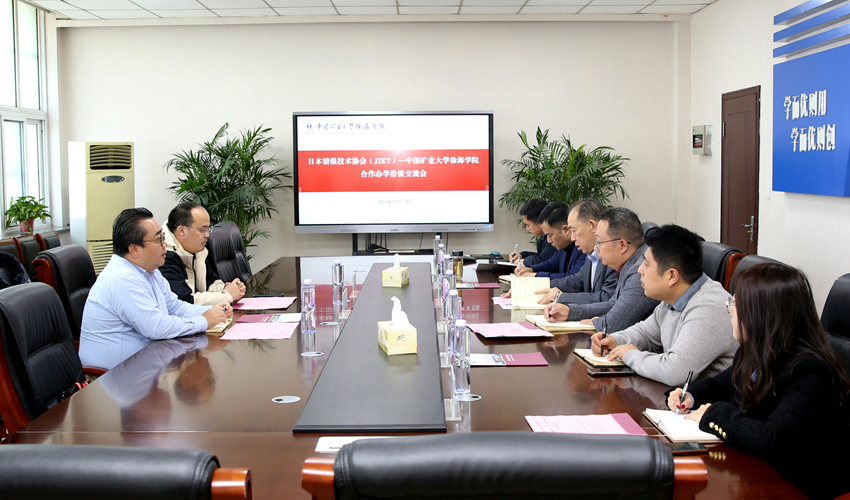 11月23日上午,日本东京IT行业协会(JIET)来院就学生就业升学交流洽谈。中国矿业大学党委常委、校长助理、徐海学院院长张万红,院长助理张伟,日本情报技术取引所代表委员、PFS株式会社社长田一辉,南京矽鼎信息科技有限公司总经理舒礼峰,计算机系主任杨磊,教务处副处长吴雪峰及相关负责同志参加会议。