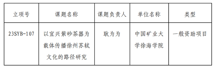 2023年度江苏省社科应用研究精品工程课题已完成申报受理、资格审查、网络系统初评、专家复评、网上公示等程序,经江苏省社科联党组审定,徐海学院外国语言文化系耿为为老师申报的《以宜兴紫砂茶器为载体传播徐州苏轼文化的路径研究》获批2023年度江苏省社科应用研究精品工程课题。