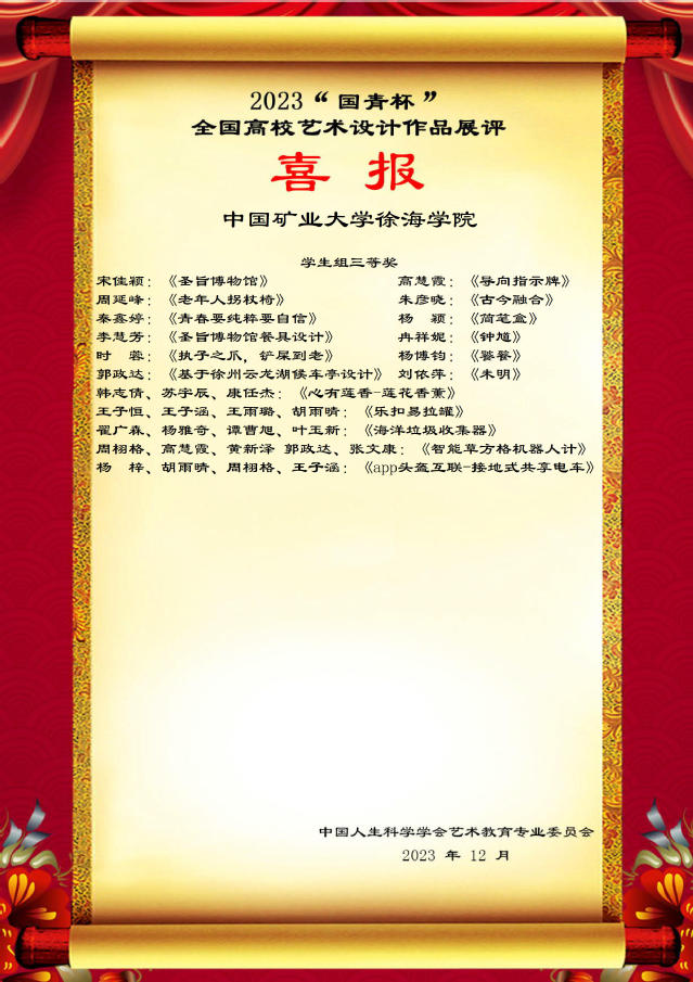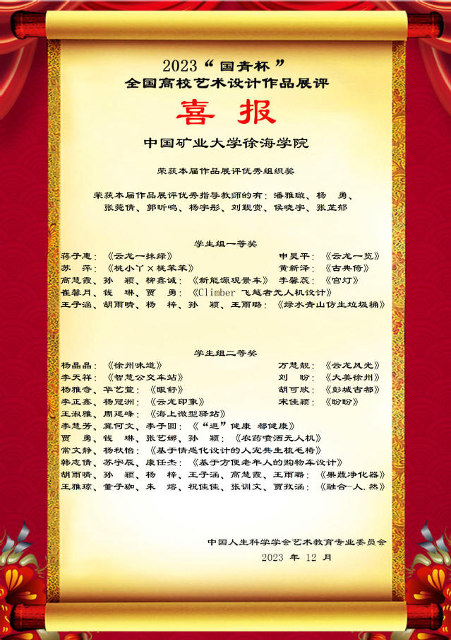 近日,2023届“国青杯”全国高校艺术设计大赛作品展评获奖名单揭晓,徐海学院选送的作品通过组委会层层评选,从全国众多参赛作品中脱颖而出、取得佳绩。其中,学生获一等奖8项、二等奖15项、三等奖17项,潘雅璇、张菀倩、郭昕鸣、张芷郁、杨宇彤、刘觐赏6位老师被评为作品展优秀指导教师,学院获评优秀组织单位奖。