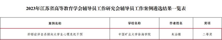 近日,江苏省高等教育学会辅导员工作研究委员会公布了2023年度辅导员工作案例遴选结果,由学工处组织推选的文艺系学工办主任朱治橙提报的工作案例《抑郁症伴自杀倾向大学生心理危机干预》荣获二等奖。