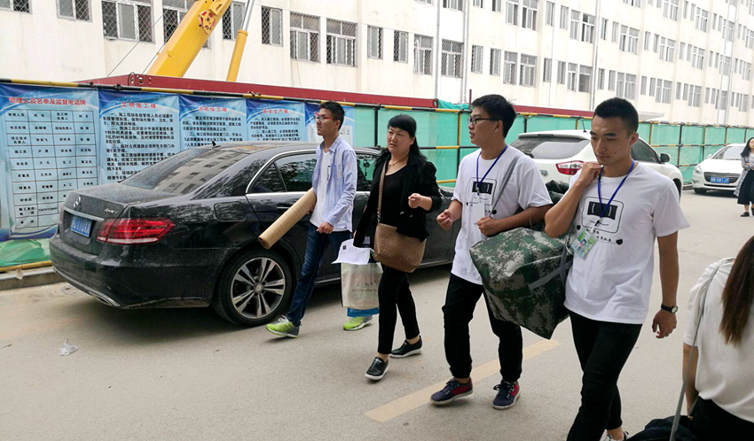 (迎新志愿服务者引导新生及其家长乘坐迎新专车)