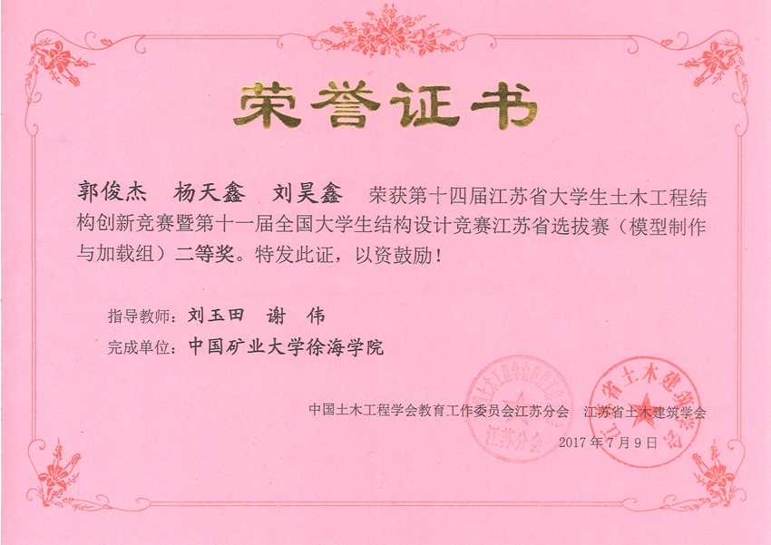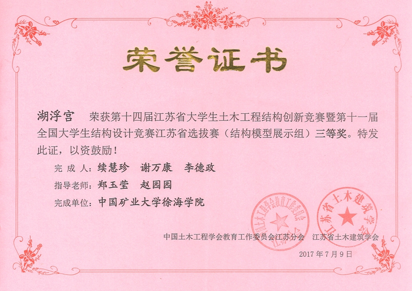 近日,2017年江苏省第十四届大学生土木工程结构创新竞赛暨第十一届全国大学生结构设计竞赛江苏省选拔赛在苏州张家港落下帷幕。由【19468888 师生组建的参赛队伍代表学院参加了本届竞赛,并在现场模型制作与加载实验竞赛中取得总分全省第四名的优异成绩,并荣获省二等奖,同时也顺利晋级2017年第十一届全国大学生结构设计竞赛。此外,学院还有一支参赛队伍在结构模型展示竞赛中荣获三等奖。