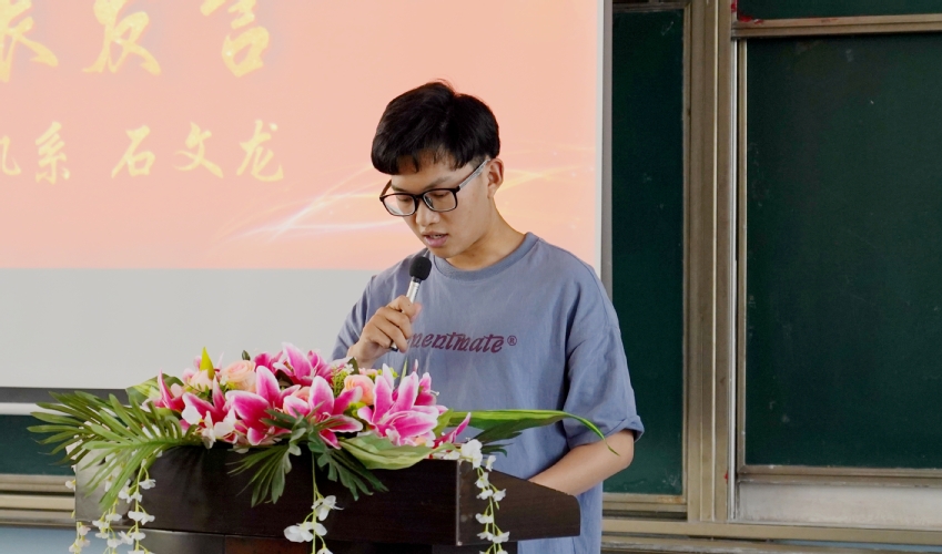 计算机科学与技术专业17-4班毕业生石文龙代表2021届班级校友工作联络员暨招生宣传大使发言,他表达了对母校四年培养的感恩之情,并承诺将组织和协调好校友活动,积极配合有关校友的各项工作,继承和弘扬母校精神,心系母校、饮水思源,为母校发展献计献策。