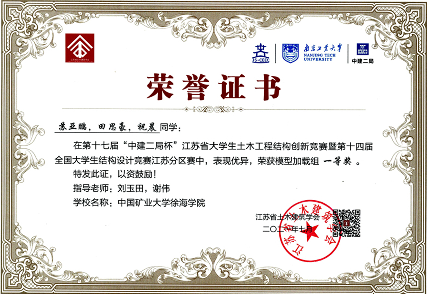 近日,第十七届江苏省大学生土木工程结构创新竞赛暨第十四届全国大学生结构设计竞赛江苏分区赛在南京理工大学落下帷幕。徐海学院建筑工程系学子苏亚鹏、田思豪、祝晨在竞赛中斩获一等奖,并顺利晋级第十四届全国大学生结构设计竞赛。