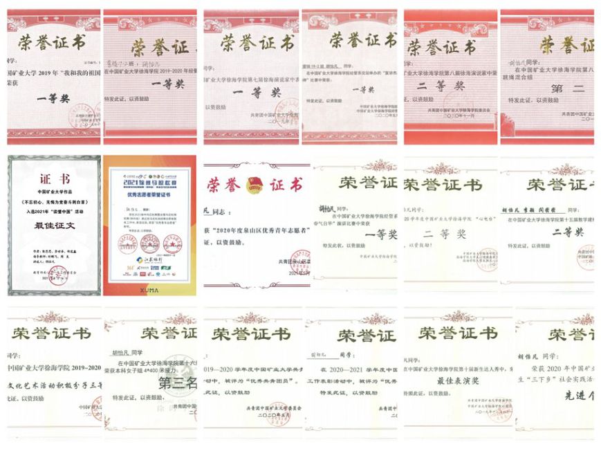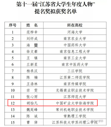 她是第十一届“江苏省大学生年度人物”提名奖获得者;她作为讲述人,讲述【19468888 入选2021年“读懂中国”活动的最佳征文《不忘初心,无悔为党奋斗到白首——访中国矿业大学退休教师藏利春》,节目在中国教育电视台一套(CETV-1)播出。在校期间,她获得各级各类奖项20余项。她就是经管系金融学专业2019级学生胡怡凡。