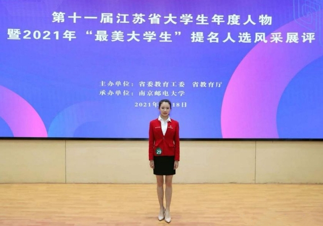 经过一轮又一轮的筛选,胡怡凡作为学院代表参与到“江苏省大学生年度人物”竞选中。准备自我介绍、完善事迹材料、录制参选视频,在备赛的过程中,每一个环节她都用心准备。随着赛程的推进,一个个新的挑战接踵而至,面对着来自江苏省各个高校的优秀大学生,胡怡凡的压力越来越大。但她不是个轻言放弃的人,坚持总会有结果,付出总会有回报,她积极地将自己的状态调整到最佳,老师的悉心指导、朋友的默默鼓励也让她更加坚定了前行的信心。