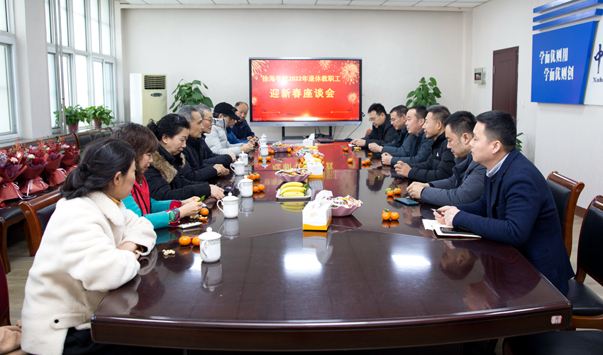 1月25日下午,徐海学院在主楼907会议室举行2022年退休教职工迎新春座谈会,退休教职工朱开永、刘坚、蔡天敏、王永红、张学惠、王兆香、李京、高新明应邀参加会议。党委书记戎辉,常务副院长于忠华,院长助理徐海波,工会主席杨磊,学工处处长时鹏飞及党政办、关工委有关负责老师出席会议。会议由常务副院长于忠华主持。