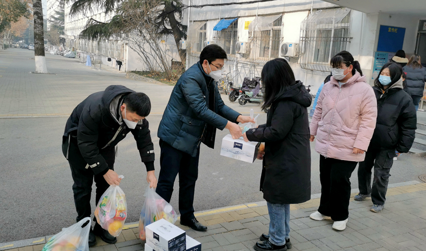 邢雅伟向留校学生致以新年祝福,并转达了学院对留校学生的关怀。他详细询问了留校学生的身体状况及留校期间的生活保障等情况,希望大家照顾好自己,注意宿舍安全,做好自己健康的第一责任人,提醒他们要多和家人联系,让家人放心。他还鼓励同学们要积极备考接下来的教师资格证面试。最后,老师们向留校学生发放了新年慰问品,祝福同学们在新的一年学业、生活更上一层楼。