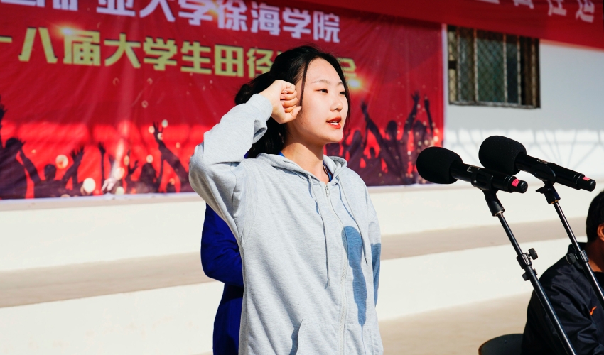 运动会总裁判长、院公共体育部主任蒋伟,外语系学生许滟楚分别代表裁判员、运动员进行宣誓。