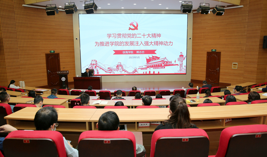 5月10日下午,徐海学院党委在文昌校区网络大讲堂召开学习贯彻习近平新时代中国特色社会主义思想主题教育动员大会暨专题党课,认真贯彻落实习近平总书记在主题教育工作会议上的重要讲话精神,对学院全面开展主题教育进行动员部署。校党委常委、校长助理、徐海学院院长张万红,党委书记熊志忠,常务副院长于忠华,副院长徐海波,院长助理张伟,五级职员周丽丽,学院党委委员,全体教职工党员,学生党员代表参加会议。会议由于忠华主持。