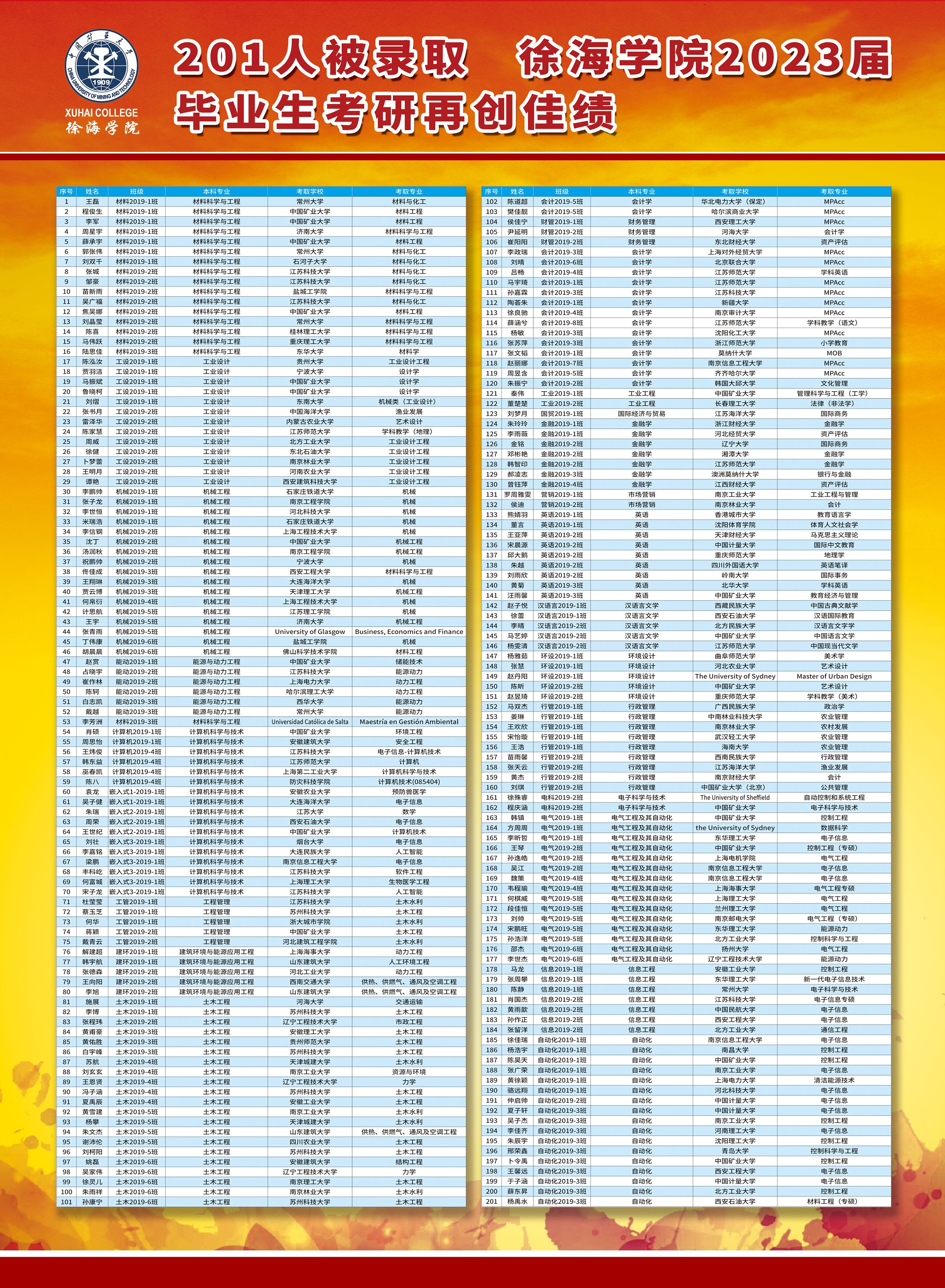 矢志耕耘结硕果,天道酬勤传佳音。近日,徐海学院毕业生考研再传喜讯,在师生的共同努力下,2023届毕业生中共有201名同学被国内外高校录取,整体录取率达9.4%。除考取中国矿业大学外,多名学子被东南大学、中国海洋大学、河海大学、香港城市大学、悉尼大学等国内外知名高校录取。