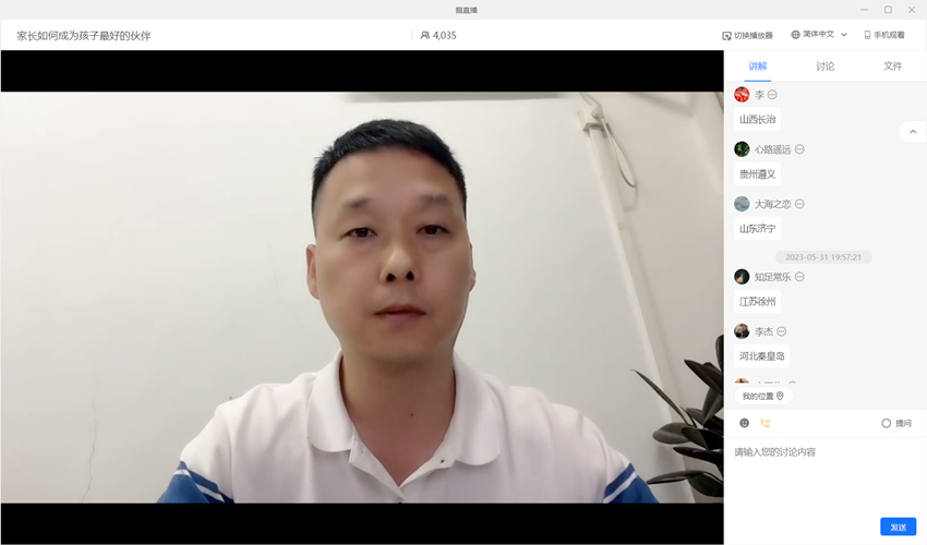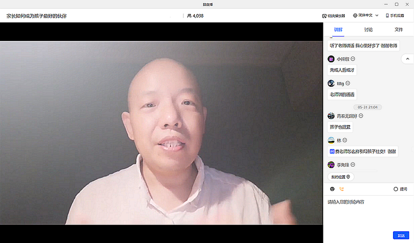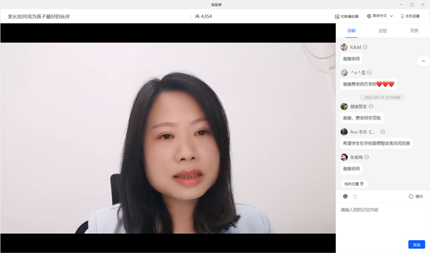 费俊峰以心理学中格式塔治疗基本理论为基础,围绕“觉察”和“接触中断”两个概念深入浅出地分析了家长如何成为孩子最好的伙伴。首先,他以互动体验的方式带领家长进行觉察力练习,引领家长觉察自我,觉察他人,觉察周围环境,并鼓励家长通过多种途径提高觉察力,从而更好地了解自己和他人。随后,他用朴实的语言、生动的案例、通俗易懂的方式系统分析了亲子沟通中的投射、内摄、融合、内转、偏转、自我中心、去敏化七种接触中断,以及如何进行调整。讲座中,家长们纷纷通过直播间讨论区留言,提出了在教育孩子过程中的困惑与苦恼,费俊峰针对家长们的提问给予细致的回答。整个课堂温暖有力、有益有趣,不但有效缓解了家长在亲子沟通中的焦虑,也为参会家长指明了未来亲子沟通、家校共育的有效途径与方向。讲座结束后,院大学生心理健康教育中心方菲老师与家长们在线交流,就父母如何关注孩子身心健康、如何加强家校沟通等方面进行了讨论和交流。
