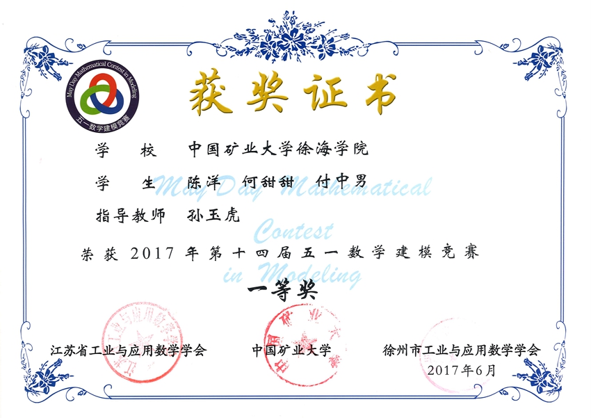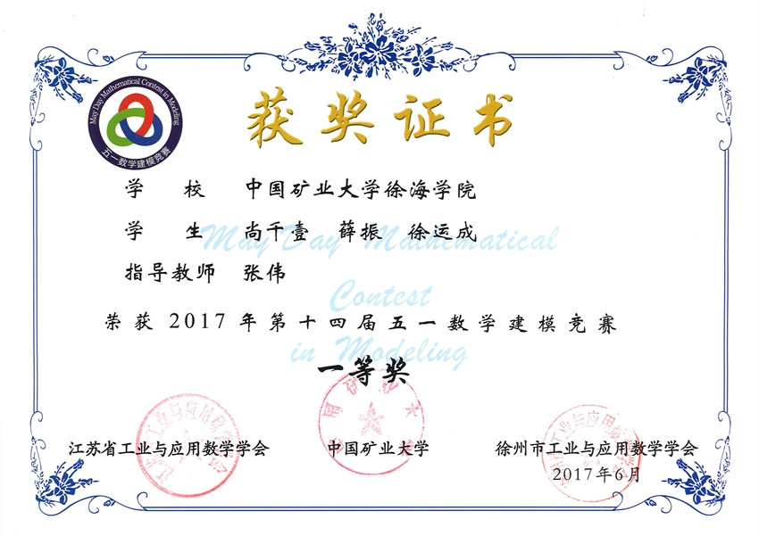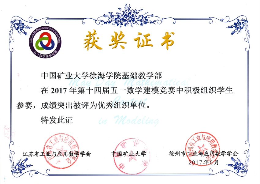 据悉,在本次五一数学建模竞赛中,徐海学子与来自北京大学、清华大学、南京大学、武汉大学、国防科学技术大学等全国31个省、市、自治区的150多所高校以及美国、英国、德国等国外高校的近5000多支队伍15000余人同台竞技,经过三天的不懈努力,最终获得一等奖5项、二等奖11项、三等奖10项,获奖等级和获奖比例在同类高校中名列前茅。在本次数学建模竞赛中,基础教学部积极组织学生参赛,被评为“优秀组织单位”。此外,学院张伟、张雷明、孙玉虎和李媛等8位教师被评为优秀指导教师”,张伟、张雷明和孙玉虎等3位老师被评为“优秀组织工作者”。
